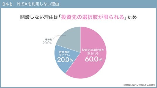 また、NISAを開設していない理由として、60%の人が「投資先の選択肢が限られる」と回答しました。その他の理由としては、「教育費に充てたい」などが挙げられています。