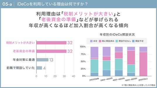 iDeCoを利用する理由として「税制メリットが大きい」「老後資金の準備」が並び、いずれも最も多い回答となりました。また、年収別で分析すると、年収が高くなるほどiDeCoの加入割合が高い傾向が見られ、収入に余裕がある層での制度活用が進んでいることがうかがえます。