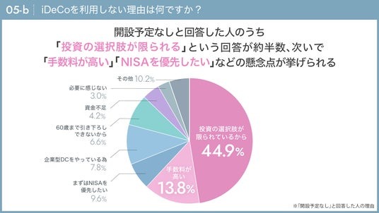 一方で、iDeCoを利用しない理由として「投資の選択肢が限られる」が約半数を占め、次いで「手数料が高い」「NISAや企業型DCを優先したい」といった理由が挙げられました。