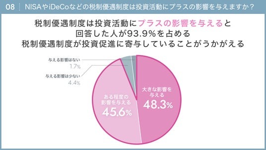 NISAやiDeCoなどの税制優遇制度について「投資活動にプラスの影響を与える」と回答した人が93.9%にのぼりました。この結果は、税制優遇制度が投資促進に寄与していることがうかがえます。