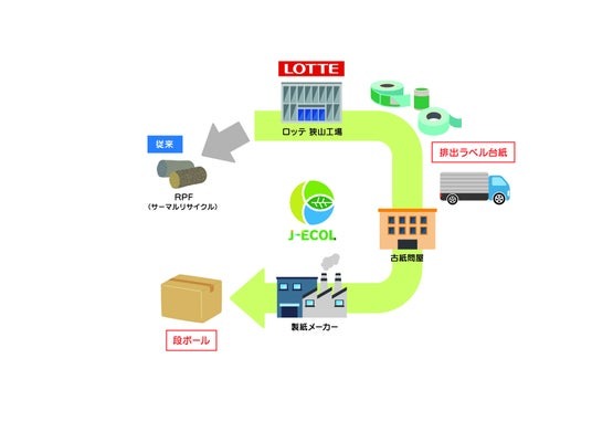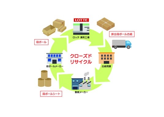 注1 マスバランス方式によるクローズドリサイクル。マスバランス方式とは、ある特性を持った原料(この取り組みでは、ロッテ工場より排出した古紙)がそうでない原料(一般に回収された古紙)と混合される場合に、原料の投入量に応じて、製品の一部に対してその特性を割り当てる手法のこと。