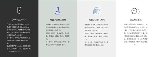 顧客ニーズに合わせた柔軟なサービス拡充多様な分野の顧客に対応するため、培養設備や精製プロセスのラインアップを強化し、個別の要件に応じたカスタマイズサービスをさらに拡充します。