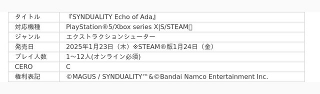 PlayStation(R)5/Xbox series X|S/STEAM(R)『SYNDUALITY Echo of Ada』に関して、