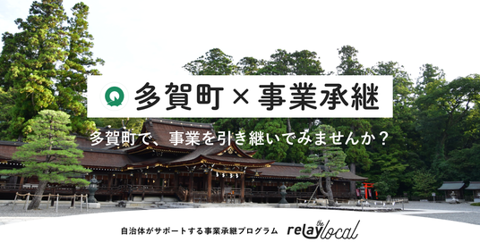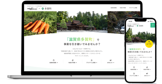 このたび多賀町とrelayは、移住・定住を伴う第三者事業承継の推進に向けて、共に取り組んでまいります。提携の第一弾として、多賀町に特化した後継者募集案件を掲載した「relay the local 多賀町」を開設いたしました。今後、多賀町に相談が寄せられる後継者不在事業者の情報をrelayに提供いただき、「relay the local 多賀町」への掲載を行います。