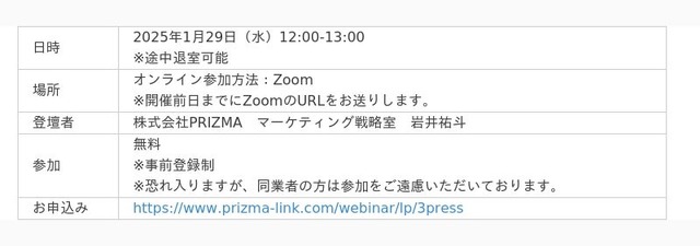 企業のPR支援プロダクト「PRIZMA」ブランドを展開する株式会社PRIZMA(https://www.prizma-link.com/)は、このたび、2025年1月29日(水)12:00~13:00に、調査リリースを活用した次世代のマーケティング戦略を学べる無料オンラインセミナーを開催いたします。BtoB企業が抱えるリード獲得やコスト効率化の課題に対し、成功事例とともにお届けします。