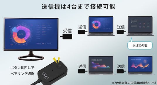 従来のセット製品をご利用中の方は、本製品を追加することで、最大4台の送信機を1台の受信機に接続できるようになります。これにより、会議・プレゼン・ゲーム・撮影現場などで、複数のデバイスを簡単に切り替えて利用可能になります。