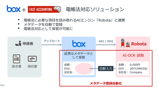 このたび、ファーストアカウンティング様のRobotaとBoxとのソリューション連携を心より歓迎いたします。このベストオブブリードのソリューションは、Box上での電帳法対応を容易にし、今後ますます高まる紙文書の電子化やペーパーレスの需要により応えられるようになると確信しています。今後も経理分野をはじめとする広い分野での現場業務の効率化を支援すべく、両社で協業を進めてまいりたいと思います。