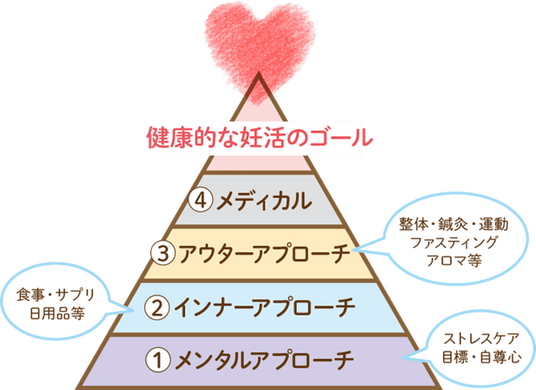 上記の妊活ピラミッドは、妊活をされている方が迷いなく妊活をするために、妊活の成功(健康に妊娠・出産し、健康な子供を産む)に必要な要素を整理したものです。妊娠だけではなく出産も、そして目の前の方が未来に授かる子供の健康も、さまざまなアプローチが必要です。特に2.のインナーアプローチにおいては、以下の4つのポイントに気を付けた食生活が大事です。