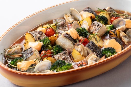 ・白身魚と有頭エビのバプール 茄子とオリーブのソース