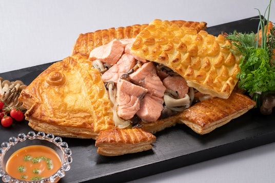 トラウトサーモンとキノコのパイ包み焼き ハーブ香る甲殻類とトマトのソース