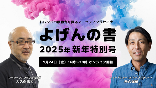 今回の再開に合わせて、10年以上社会に対する「よげんの書」の発表を続けてきた”ソーシャリングラボ 大久保惠司氏”を迎えて、2024年の変化を振り返りながら、2025年の「20のよげん」を発表する特別版を1月24日(金)16時から開催します。