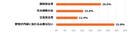 いずれかの野党が仮に石破内閣に加わる場合、どの政党がいいと思うかを複数回答で聞くと「野党が内閣に加わる必要はない」33.8%が最も多く、政党名を挙げた人の中では、国民民主党26.0%、日本維新の会15.6%、立憲民主党12.4%の順となった。