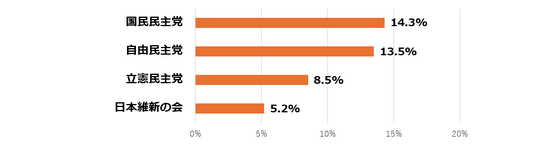 夏の参院選の比例代表で投票したい政党、投票したい候補者が所属する政党を聞くと、国民民主が14.3% (前回2024年12月23日10.2%)で首位となり、自民13.5%(16.2%)、立憲8.5%(7.8%) 、維新5.2%(6.4%)と続いた。まだ決めていない人が39.5%、投票に行くつもりはない人は5.5%だった。国民民主と答えた人を年代別に見ると、全般的に年代が低いほど多い傾向があった。立憲は60代、70代以上の各層で最多となった。