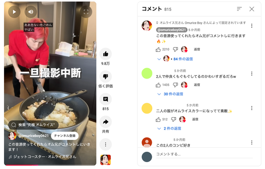 料理系クリエイターでありながらエンタメに強いオムライス兄さんを起用、投稿のコメント欄に「この音源を使ってくれたらオム兄がコメントしに行きます」と記載したことにより、楽曲を利用した投稿が増え、3曲で合計56,000投稿、総再生回数11億2000万回のUGCを創出しました。