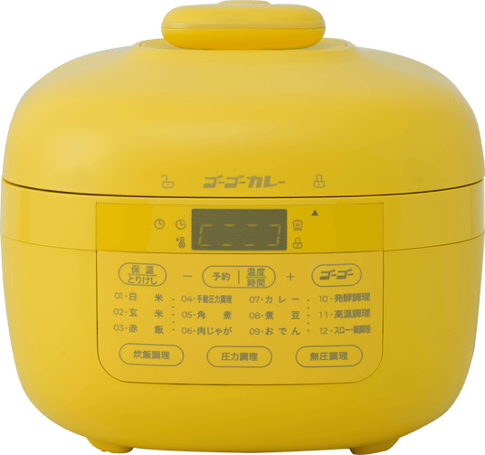 ゴーゴーカレーのロゴ入り「ゴーゴーボタン」を採用。このボタンで全ての調理がスタートし、電気圧力鍋ならではの便利さを実感できます。さらに、本体カラーにはターメリック色の“ゴーゴーイエロー”を採用し、キッチンを華やかに彩ります。