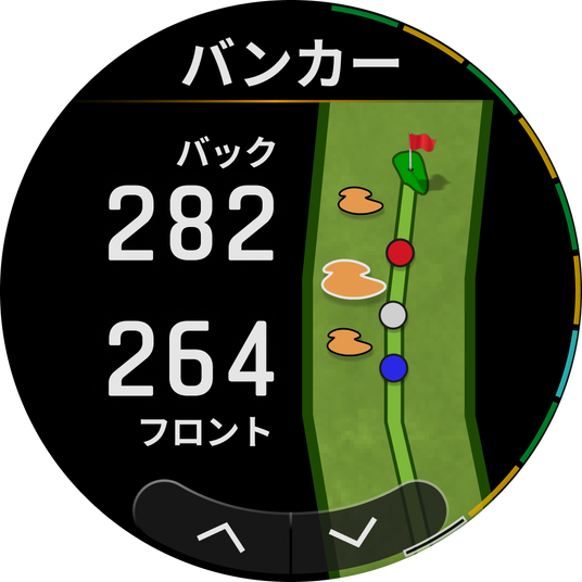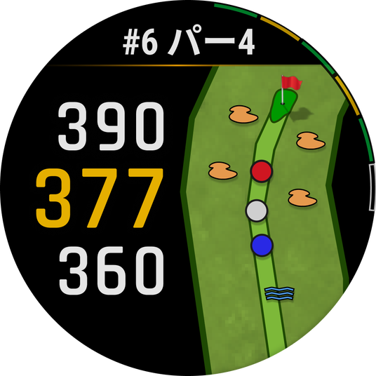 ■ハザードビュー/ハザード情報バンカーや池などの各ハザードまでの距離を表示。コース戦略に役立てることが可能です。