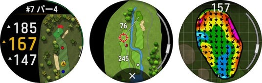 左から、コースレイアウト(第2世代)、タッチターゲティング、グリーン傾斜情報