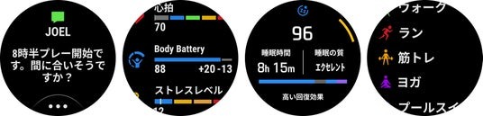 左から、通知機能、健康管理機能、睡眠スコア、スポーツアクティビティ