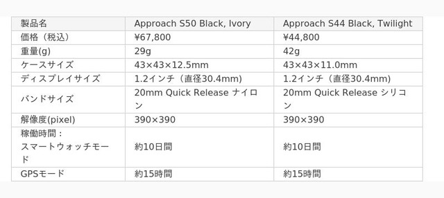 『Approach S50』はアルミニウムベゼルにメタルボタンを配し、ナイロンバンドを採用。『Approach S44』はアルミニウムベゼルにプラスチックボタンを配し、シリコンバンドを備えたデザインです。