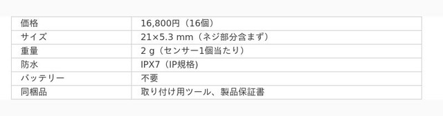 センサー1つあたり2gの超軽量かつスリム設計で、バッテリー交換が不要のNFCセンサータグを採用しています。さらに16個のフルセットで16,800円(税込)という価格も魅力的です。