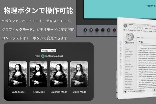 クリア、4段階のメニュー、コントラストの変更、フロントライト、電源の6つのボタンが備わっているため、電子ペーパーで生じる表示の問題を、ボタンで手軽に変更ができます。特にモノクロディスプレイで画像を表示する際には、コントラストを下げることで細部の視認性が向上します。また、周囲の環境に合わせてフロントライトをご使用いただくことができます。