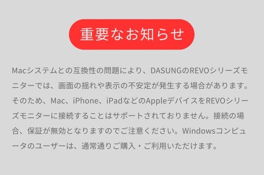 REVOシリーズは、Macシステムとの互換性がなく、ちらつきや表示不安定の問題が発生する場合があります。Windowsユーザーには最適な選択肢となりますが、Macシステムとの接続を行った場合は、メーカーの保証対象外となります。そのためMacユーザーには購入をおすすめしません。MacユーザーはBASEシリーズのご利用をおすすめします。
