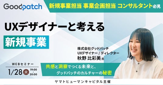 ヤマトヒューマンキャピタル株式会社(本社:東京都千代田区、代表取締役:堀江 大介)は、2025年1月28日(火) 19:00よりオンラインにて、株式会社グッドパッチ UXデザイナー / ディレクター 秋野 比彩美 氏にご登壇いただくウェビナー『UXデザイナーと考える新規事業-共感と洞察でつくる未来と、グッドパッチのカルチャーの秘密-』を開催いたします。