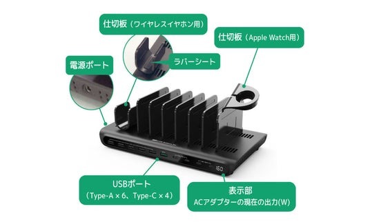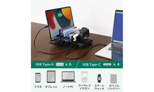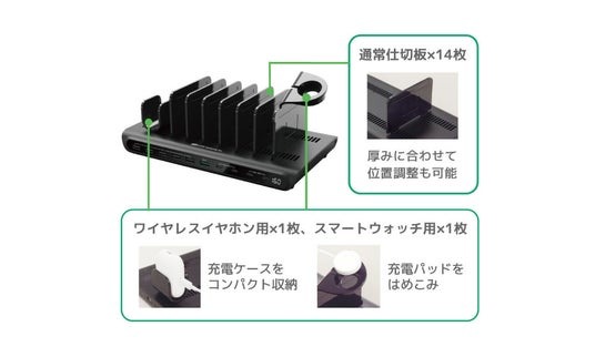 本製品は、スマホやタブレットを10台まとめて充電できるUSB充電器です。ワイヤレスイヤホンやスマートウォッチ用の仕切板も同梱しており、様々なデバイスをすっきりと収納することができます。