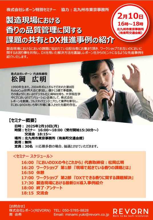 製造現場におけるにおいの課題に悩まれている担当者にお集まり頂き、ワークショップでお互いのにおいに関するお困り事を共有し、DXを用いた解決方法を議論しレボーン社からのヒントになるような先進事例を紹介いたします。