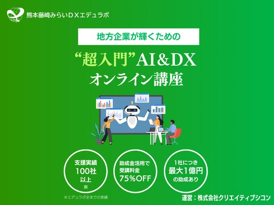 株式会社クリエイティブシコン(熊本県熊本市)は、地域みらい総研株式会社(東京都港区)と連携し、DX(デジタルトランスフォーメーション)およびAI研修サービス「熊本藤崎みらいDXエデュラボ」を開始いたします。まずは自社グループ企業向けに研修を提供し、その成果を基に、より広く地域企業や全国企業に向けてサービスを拡大していく予定です。