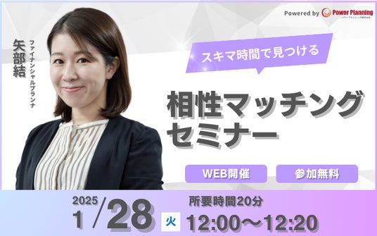 無料マネーセミナー提供サービス「アットセミナー」を運営しているパワープランニング株式会社が「1月28日(火) 12時」に「相性マッチングセミナー」というスキマ時間で自分に合ったFPを見つけられるオンラインセミナーを開催いたします。
