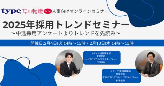 転職サイト「type・女の転職type」では、2/4(火)、2/13(木)14時より、「2025採用トレンドセミナー~中途採用アンケートよりトレンドを先読み~」を開催いたします。