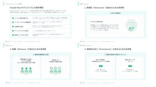 本資料では、Googleマップにおけるアルゴリズムの基本構造や、検索順位を決める主要要素について具体例を添えながら紹介しています。