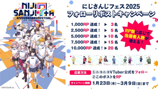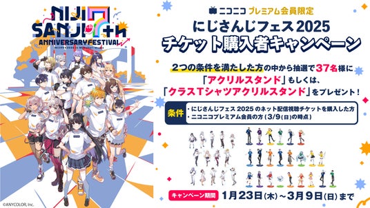 さらに「にじさんじフェス2025」の開催を記念して、2つのキャンペーンをニコニコにて実施します。ネット配信視聴チケットのいずれかを購入したニコニコプレミアム会員の中から抽選で37名の方にアクリルスタンド(全37種)をプレゼントするものと、ニコニコVTuber公式X(@nicovtuber_PR)をフォロー&指定の投稿をリポストした方の中から抽選でSNS風ランダムクリアカード(全10種。当選者数はリポスト数に応じて決定)をプレゼントするものです。応募期間は1月23日(木)から3月9日(日)まで。