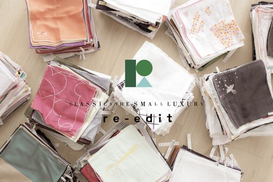 製造工程で時々でてしまう、生地にほんの小さなキズや汚れがついたハンカチーフがあります。従来なら破棄されるはずだったそれらに再び息を吹き込み、新たに誕生したのがre-edit の商品です。re は「再び」、edit は「編集する」という意味です。