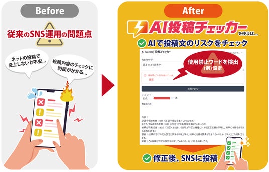 - 投稿スタッフの心理的負担軽減:AIがリスクを判別することで、スタッフの負担を軽減。安心してSNS投稿を行うことができます。