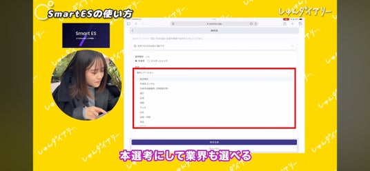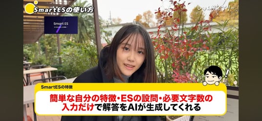 動画内では、学生が苦手とする自己PRや志望動機の記述を『SmartES』のアドバイスを活用して明確化する様子が描かれています。