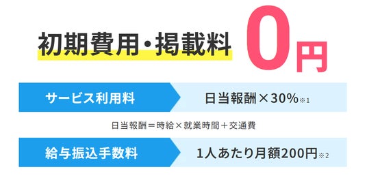 初期費用・掲載費用はかかりません。ご利用にかかる費用は「サービス利用料」と「振込手数料」のみであり、シンプルな料金体系となります。