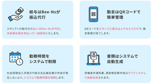 さらに、勤怠管理はQRコードで読み込んでもらうだけで完了します。また社会保険加入手続き等が発生しないようにシステムで勤務時間を制限し、労働条件通知書や源泉徴収票はシステムで自動生成されるため、労務管理周りの煩わしさは発生しません。