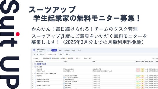 株式会社スーツ(所在地:東京都千代田区、代表取締役社長CEO:小松 裕介)は、チームでかんたん、毎日続けられるプロジェクト・タスク管理ツールの経営支援クラウド「Suit UP」(スーツアップ)において、学生起業家の無料モニターを募集いたします。
