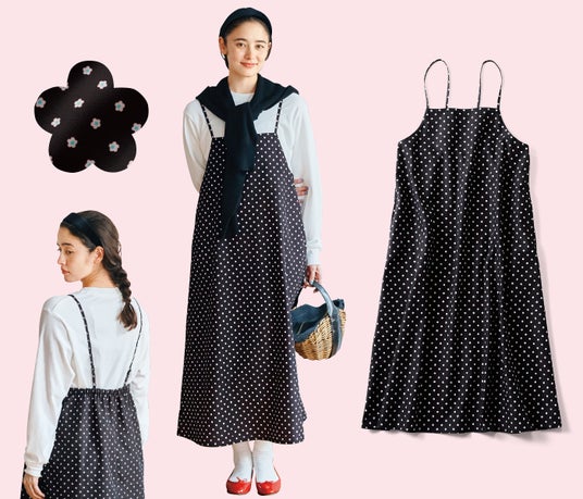 淡いピンクのかわいらしいさくら草の柄に深いブラウンが大人っぽさを演出。たっぷりと生地を贅沢につかったキャミワンピースで、ブラウスやTシャツ、スウェットなど中に合わせるものでいろいろな雰囲気を楽しめます。