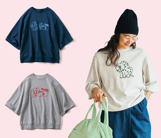 薄手で軽い着心地のミニ裏毛素材で七分袖のスウェットです。胸には毛足があるレトロなフロッキープリントで「ヒョウ」「トラ」2匹がよりそってる「なかよし柄」の3つの柄で登場。1枚でも重ね着してもかわいいから、長いシーズン活躍しそうです。