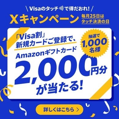 キャンペーン期間中に、「Visa割」に新規カード登録をした人が対象となります。Visaの公式Xアカウントのキャンペーン投稿の応募用のリンクをクリック、キャンペーン応募ページへ移動し、必要項目を入力すると、抽選で1,000名様に、Amazonギフト券2,000円分が当たります。