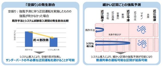 また、本システムの導入により、従来の気象予測エリアよりも細かい区間ごとの強風予測が可能となりました。特に、近江舞子駅から近江塩津駅に至る区間において、より詳細な強風予測が実現することで、普通列車の運転可能な区間を延長することが可能となります。