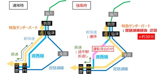これに対しJR西日本では、気象予測をもとに、特急サンダーバードの琵琶湖線経由での迂回運転や、普通列車の事前の運転見合わせを行っております。