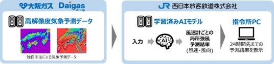 強風予測システムは大阪ガス独自の高解像度な気象予測データを、JR西日本が開発した学習済みAIモデルで解析し、24時間先までの風速と風向きを予測します。本システムにより湖西線沿線(大津京駅~近江塩津駅周辺)における局地風況を高い精度で予測でき、その結果から運行計画を判断することが可能となります。強風見込みに対し実際は強風が吹かない「空振り」を減らすことで、迂回運転や計画運休を減らし、さらなる輸送品質の向上につなげます。