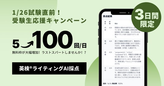 スタディスタジオ株式会社(本社:東京都渋谷区、社長:鈴木孝一、以下「当社」)は、英検(R)第3回のD/E/F日程(1月24~26日)および本会場試験(1月26日)を控える受験生に向けた特別キャンペーンとして、これまで「1日5回まで無料」だったライティングAI採点ツールを、1日100回まで利用可能に拡大いたします。会員登録不要で、その日の24時を過ぎると再び100回利用できるようになります。期間は1月24日から1月26日までの3日間です。