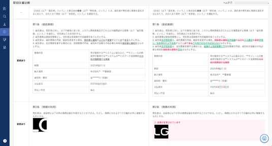 さらに、文書比較の機能は、OLGAのアカウントを持っている事業部門のメンバーも利用でき、契約書内に記載された表の要項が変更されていた場合や、不動産契約書やロゴ使用契約書、業務委託契約書などで頻出する契約書内の画像や図面の変更も、事業部門のメンバーが差分を確認することも可能になります。
