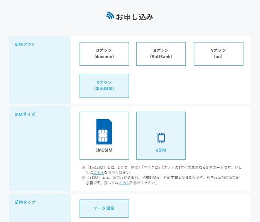 お申し込みフォームから、契約プランで「Rプラン(楽天回線)」を選択いただくことで、eSIMをお選びいただけます。