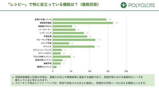 ・英語学習アプリ『レシピー』では、利用者が特に「単語検索機能」と「充実した記事の内容」